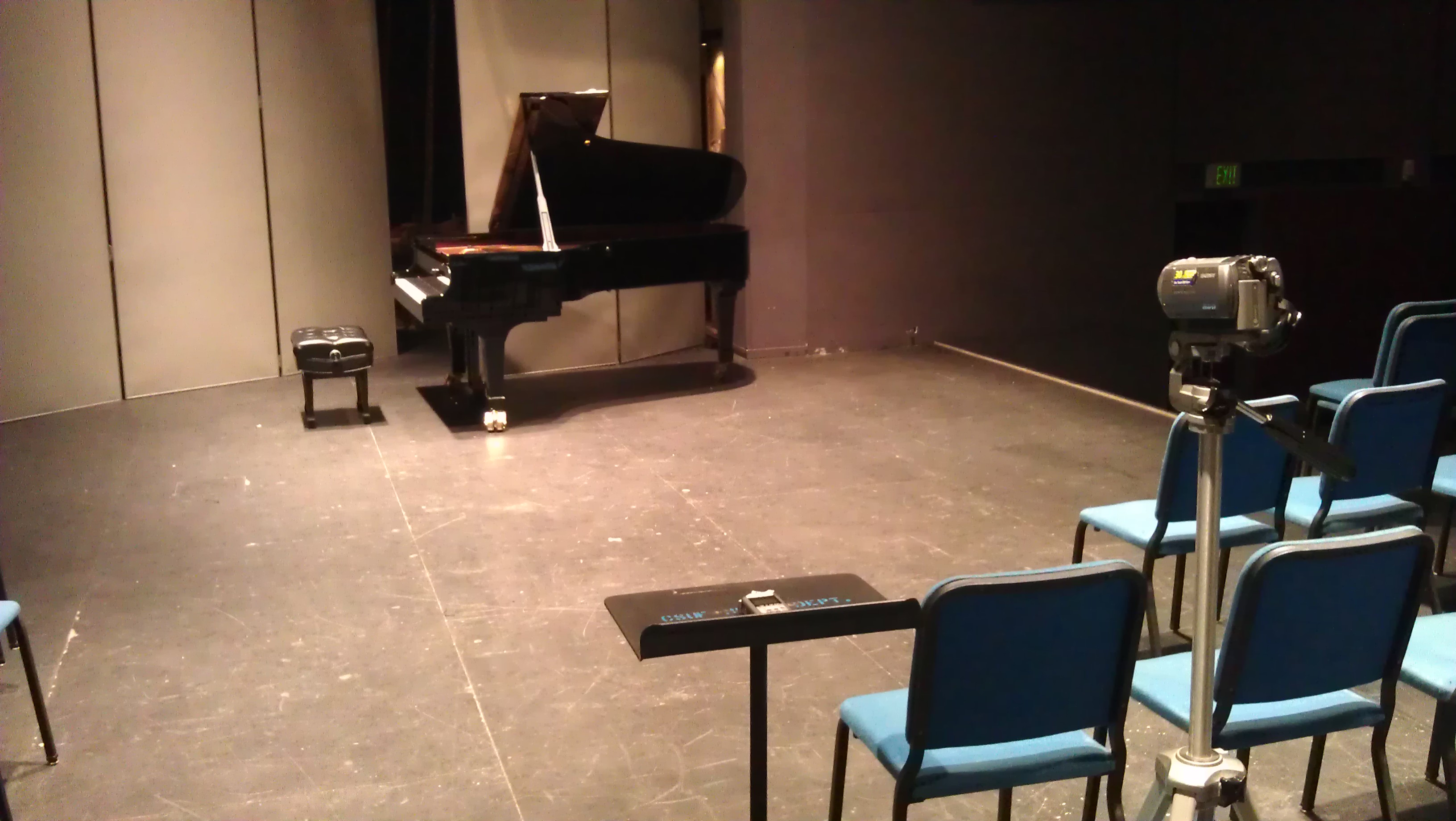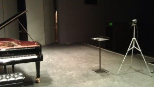 My initial, poor recording position for the first movement of Beethoven’s “The Hunt” Sonata. I was afraid that there would not be enough space for the camcorder if the piano was adjusted conventionally, but this ironically ended up being way too far. The audio device is also poorly placed.